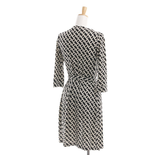 ■ DIANE von FURSTENBERG ラップワンピース 半袖 トップス アウター 前紐 総柄 シルク レディース 0 (XS相当) ブラック アイボリー