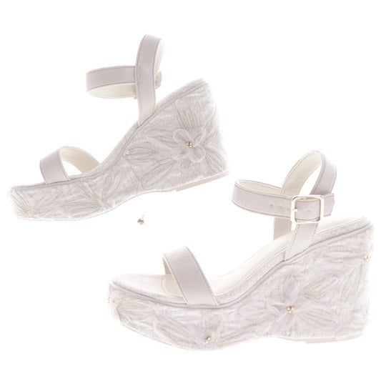 ■ ランダ サンダル PS33257Y 靴 ウェッジソール 厚底 刺繍 シフォンフラワー レディース LL グレー 付属品付き 未使用