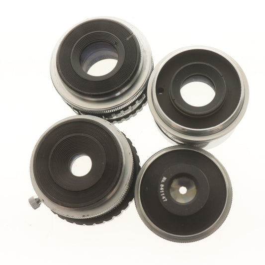 ■ 4-piece camera lens set (bulk sale) E-LUCKY 1:4.0 f=38mm, FUJINAR-E Hexar 1:4.5 f=9cm, 5cm, 75mm, with accessories, light meter, and belt