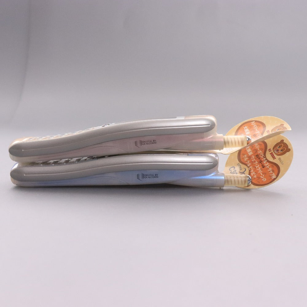 Set of two cdmaOne au by Sony PJ Berri C305S flip phones (light blue and light pink) mockups.