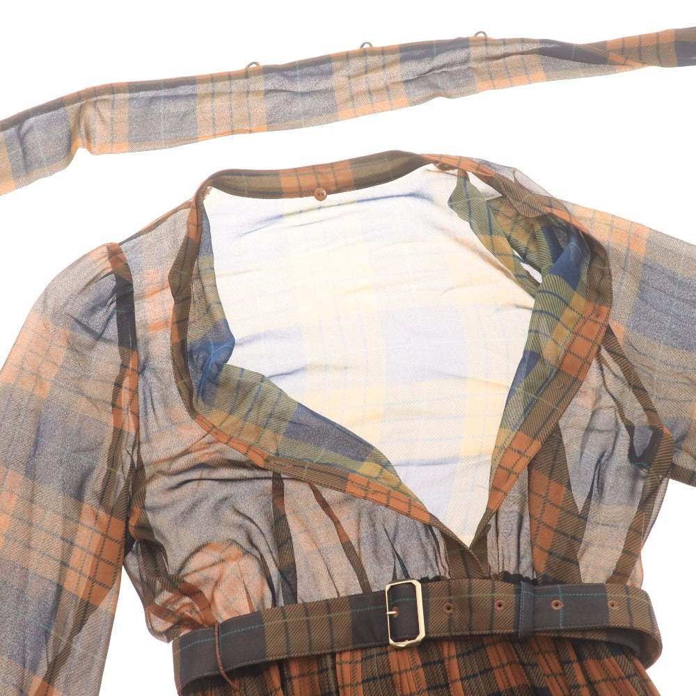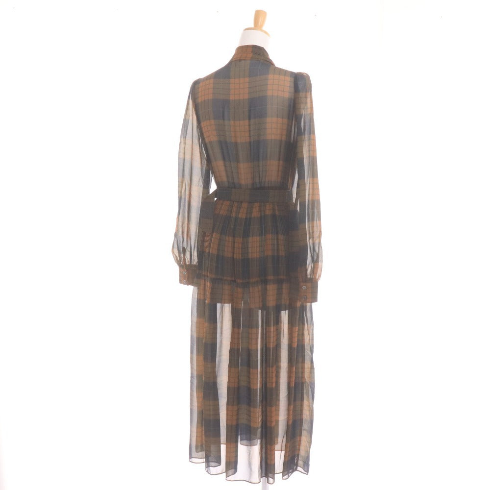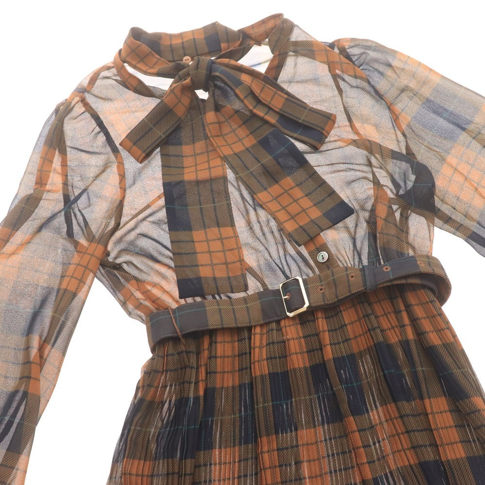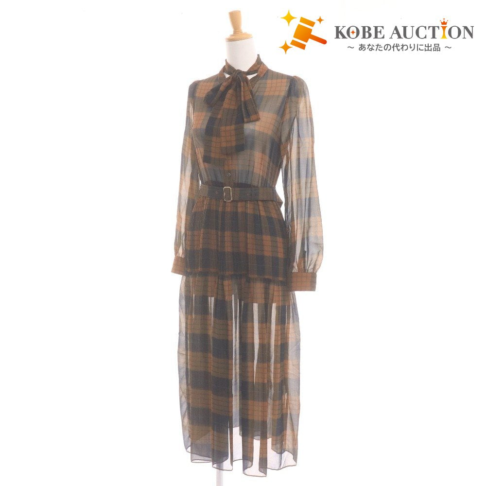 ダイアグラム ロングワンピース 長袖 トップス ボウタイ 着脱式 フロントボタン チェック柄 ベルト レディース 36 ブラウン ネイビー