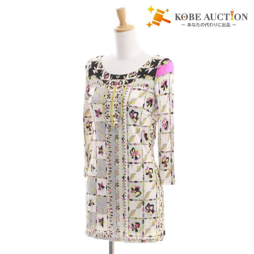 EMILIO PUCCI カットソー ミニワンピース 長袖 トップス 前カン 総柄 イタリア製 レディース 実寸 XS相当 マルチカラー ホワイト 等
